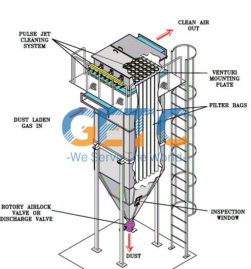 Nəbz torbası filtri kül hunisi, yuxarı qutu, orta qutu, aşağı qutu və digər hissələrdən ibarətdir və yuxarı, orta və aşağı qutular kamera strukturlarına bölünür. İşləyərkən tərkibində toz olan qaz giriş kanalından kül bunkerinə daxil olur, qaba toz hissəcikləri birbaşa kül qabının dibinə düşür, incə toz hissəcikləri hava axını ilə yuxarıya doğru orta və aşağı qutulara daxil olur, toz yığılır. filtr torbasının xarici səthində və süzülmüş qaz yuxarı qutuya təmiz qaz toplama borusu-çıxarma kanalına daxil olur və ventilyator vasitəsilə atmosferə axıdılır. Külün təmizlənməsi prosesi əvvəlcə kameranın təmiz hava çıxışı olan hava kanalını kəsməkdən ibarətdir ki, kameranın parça torbası hava axını keçməyən vəziyyətdə olsun (hava kamerada dayandırılır və təmizlənir). Sonra nəbz klapanını sıxılmış hava ilə nəbz spreyi ilə təmizləmək üçün açın, bağlama klapanının bağlanma müddəti çiləmədən sonra filtr torbasından soyulan tozun kül çəninə çökməsini təmin etmək üçün kifayətdir ki, bu da tozun yapışdığı fenomenin qarşısını alır. Filtr torbasının səthini tərk etdikdən sonra hava axını ilə bitişik filtr torbasının səthini təmizləyin ki, filtr torbası hərtərəfli təmizlənsin və işlənmiş klapan, nəbz klapan və kül boşaltma klapan proqramlaşdırıla bilən nəzarətçi tərəfindən tam avtomatik idarə olunur.