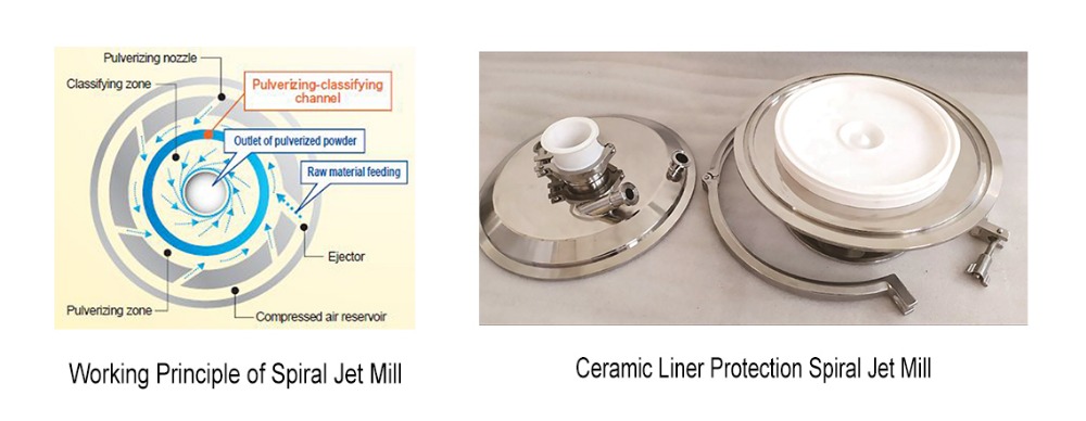 Spiral jet mill is a horizontal oriented jet mill with tangential grinding nozzles located around the peripheral wall of the grinding chamber. Materials are speeded up through venturi nozzle by a high-speed fluid discharged by pusher nozzle and enter into a milling zone. In the milling zone materials are crashed and milled each other by the high-speed fluid discharged from grinding nozzle. Grinding and static classification both occur with a single, cylindrical chamber.