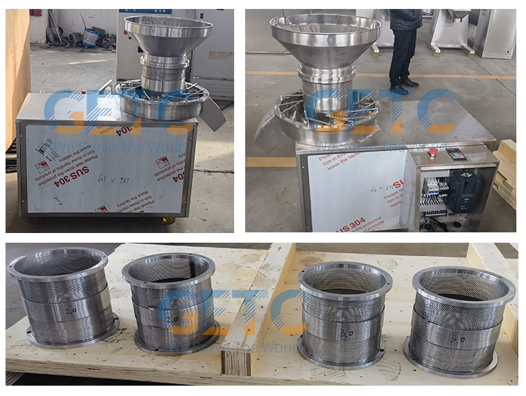 The rotary extrusion granulator adopts the new processing technology, and the parameters of the granulator are improved, so that the contact surface with the material has a certain arc. When pelleting, the pelleting blades and screen mesh fit better, so that the material does not turn up, and the pelleting is smooth.