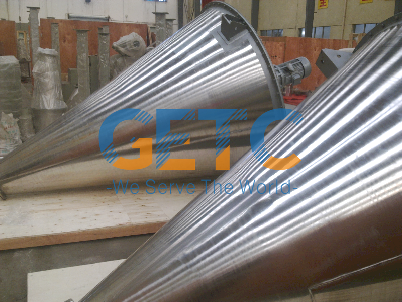 Conical Double Screws Mixer is asymmetrically cantilevered with two combined helixes, one is longer than the other, they make rotation circle their axes and at the same time make revolution circle the cone’s center axis, by which the material will be elevated repeatedly and form shearing, convection and diffusing in the cone cylinder to realize perfect mixing effect.