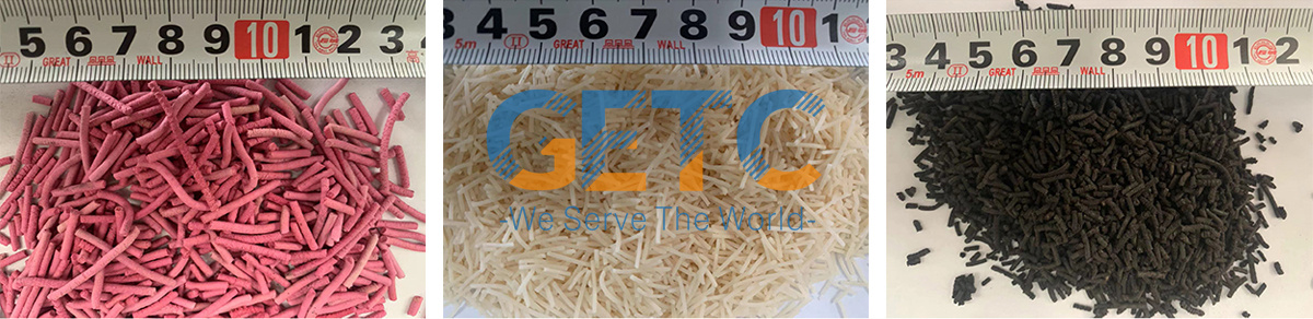 Affected by extrusion force produced in the course of screw conveying, wet materials undergoing mixing and kneading, or materials with low softening point (generally lower than 60℃) is extruded from formwork apertures at the head, forming strips of materials and short-column particles after being dried or cooled, thus achieving the purpose of changing powder into uniform particles. The particles are cylindrical (or special irregular sections). Diameter of particles can be adjusted and controlled by adjusting formwork aperture diameter; diameter of particles under side discharge ranges between 0.6 to 2.0 mm; diameter of particles under front discharge ranges between 1.0 to 12mm; Natural breaking length depends on bonding strength of materials, and generally is 1.25 to 2.0 times as much as the diameter. Front extrusion requiring special length may use exterior cutting mode. In this way, relatively uniform particles may be obtained. In most cases, granulation rate is higher than or equal to 95%.