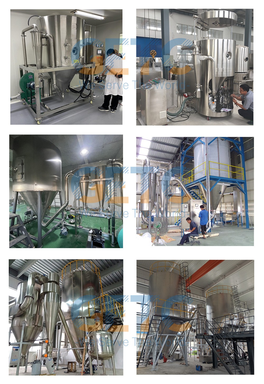 After the air been filtered and heated the air enters into the air distributor on the top of the dryer. The hot air enters into the drying room in the spiral form and uniformly. Passing through the high-speed centrifugal sprayer on the top of the tower, the material liquid will rotate and be sprayed into the extremely fine mist liquid beads. Through the very short time of contacting the heat air, the materials can be dried into the final products. The final products will be discharged continuously from the bottom of the drying tower and from the cyclones. The waste gas will be discharged from blower.