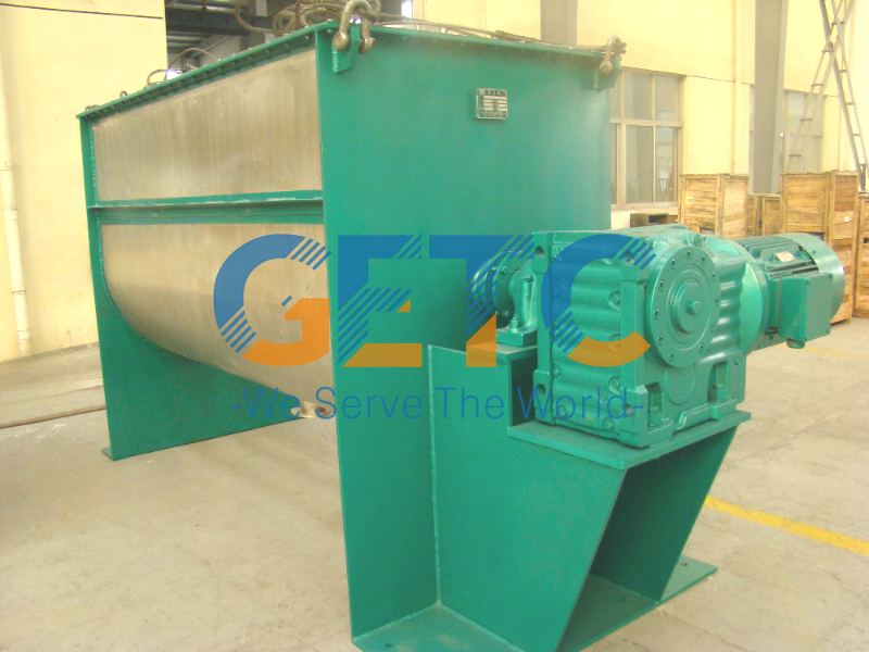 Horizontal ribbon mixer consists of drive disk assembly, double layer ribbon agitator, U-shape cylinder. Inside ribbons move materials toward the ends of the ribbon blender whereas the outside ribbons move material back toward the center of the ribbon blender, therefore, materials get fulling mixing. Materials flow direction are determined by ribbon angle, direction, twining method. Material outlet are located in the middle of cylinder bottom. Outside ribbon driven by main shaft moves materials to discharging to ensure no discharging dead zone.